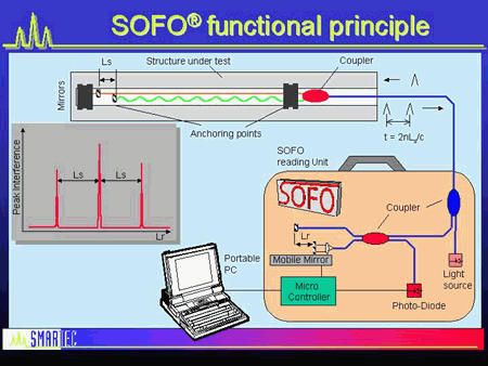 它基于與點(diǎn)光傳感器部分所述相同的白光干涉測(cè)量基本原理以上。來自白光源的光通過光纖傳輸?shù)焦鈱W(xué)傳感器。這里的傳感器由一個(gè)光纖耦合器組成,該光纖耦合器分成兩根不同長度的光纖,每端都有一個(gè)微型鏡子。參考該配置作為Mach-Zehnder或傳感干涉儀。入射光脈沖由耦合器分成兩個(gè)脈沖,并且在返回時(shí),兩個(gè)脈沖在時(shí)間上分開t = 2nLs / c,其中n表示玻璃纖維的折射率,Ls 表示纖維的長度差異和c光速。一根光纖連接到被測(cè)結(jié)構(gòu)上,而另一根光纖非常接近但沒有連接。結(jié)構(gòu)的變形導(dǎo)致路徑差2nLs 的變化。在這種情況下,它通過使用掃描移動(dòng)設(shè)備來測(cè)量