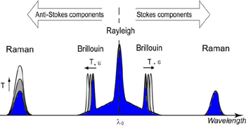 發(fā)現(xiàn)瑞利散射分量與入射光具有相同的波長l 0。有兩個(gè)拉曼分量偏移相同的量(斯托克斯分量)和低于l0(反斯托克斯組件)。類似地,布里淵背向散射由兩個(gè)在低于和高于l 0的